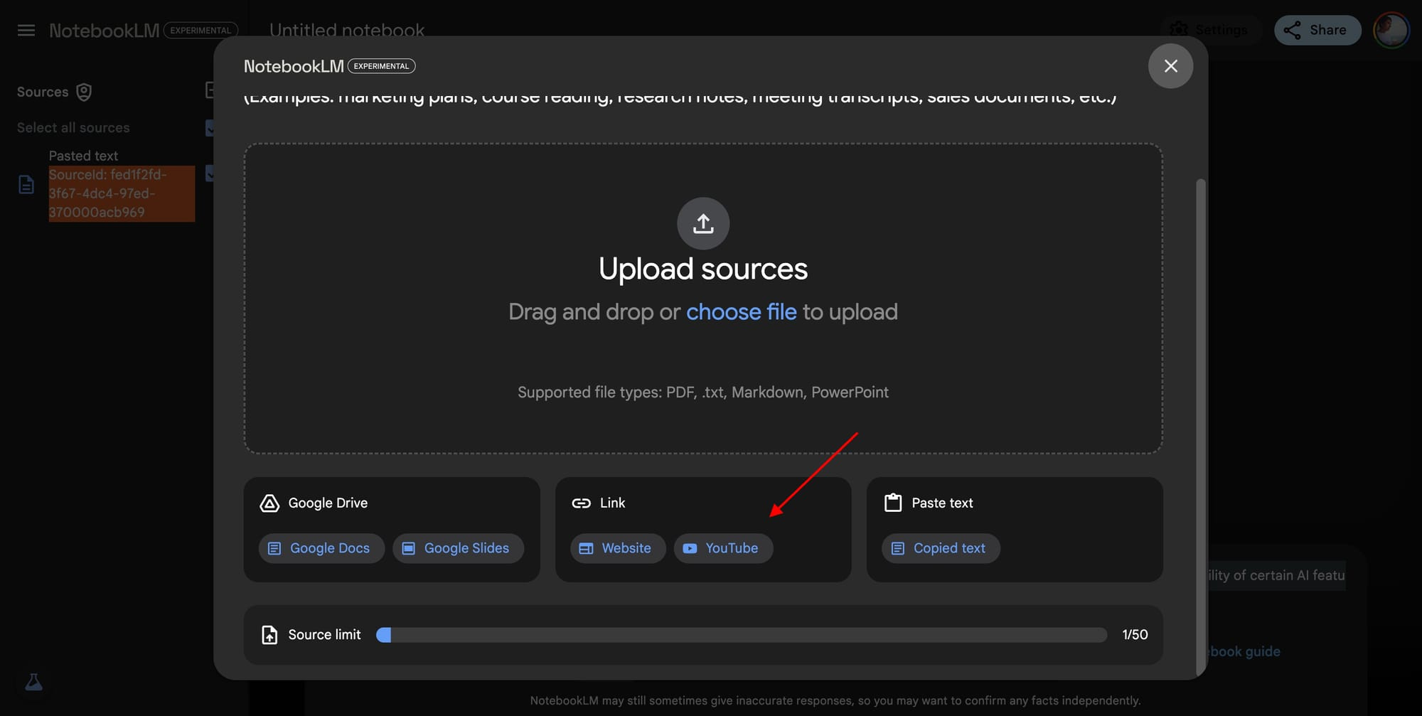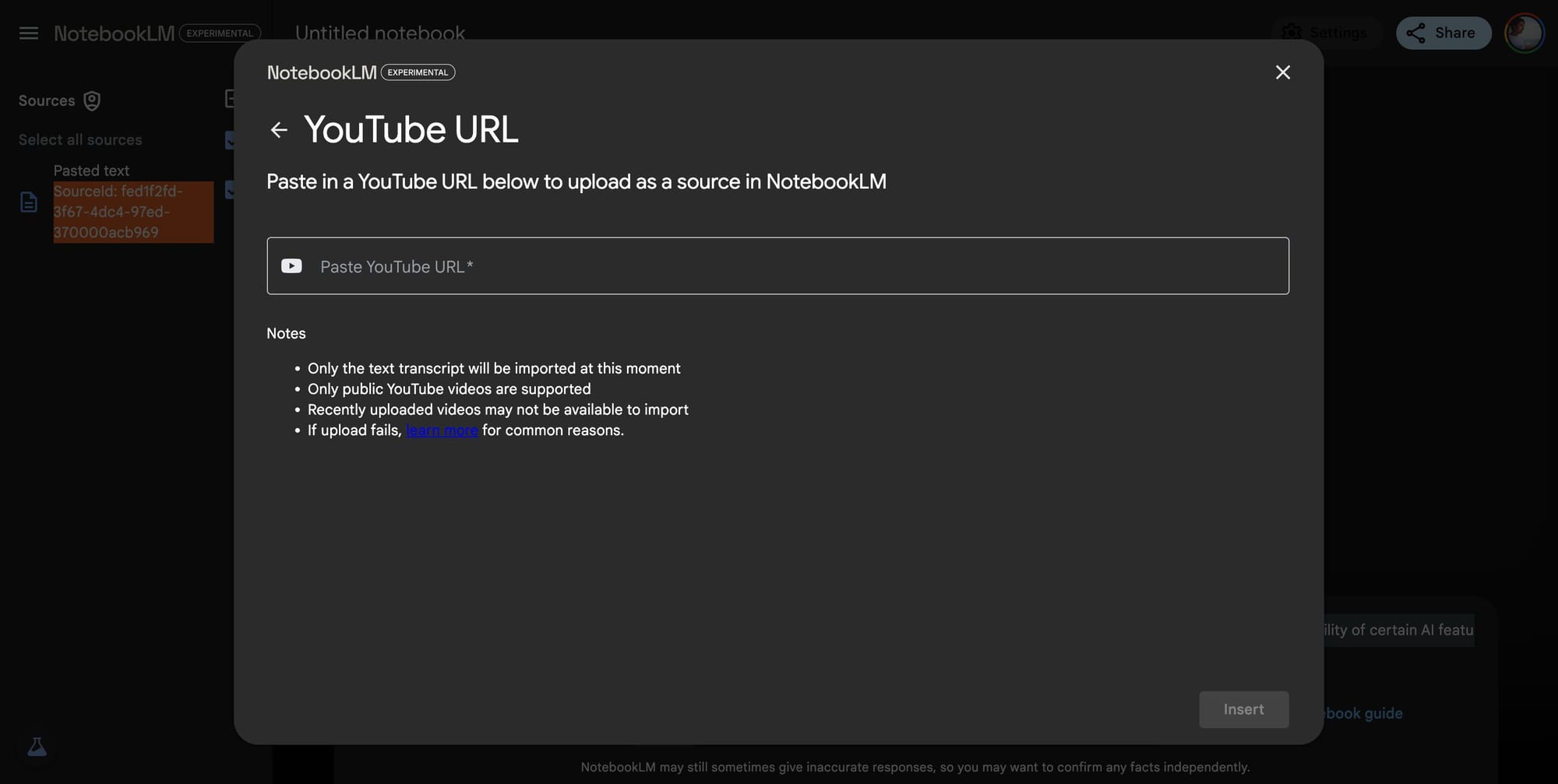 Transcript Requirement: YouTube videos require available transcripts to be processed by NotebookLM, ensuring that the AI can accurately analyze and summarize the content.